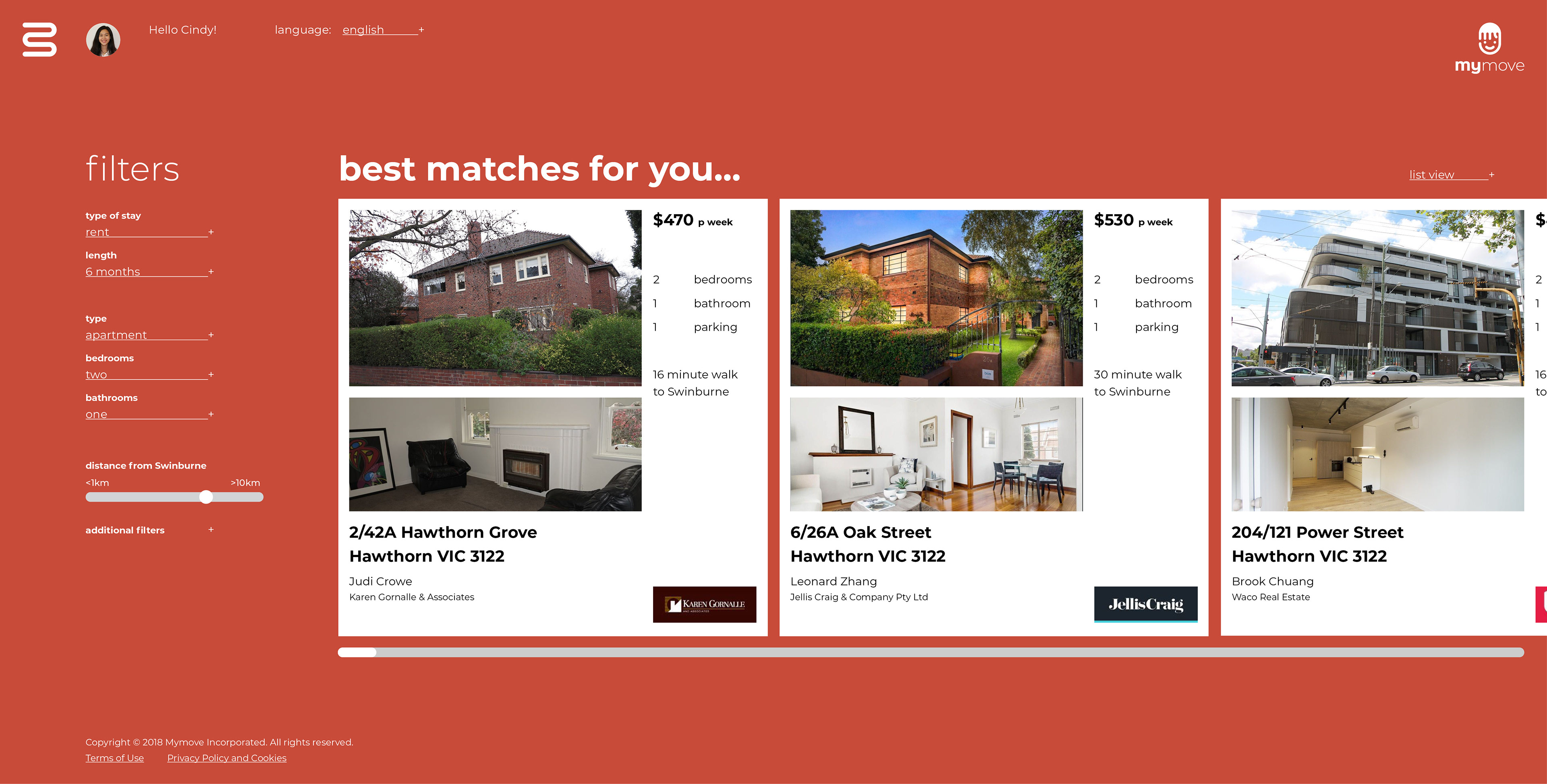 In our group of four, we proposed MyMove, a user-centred experience that helps international students to not only locate new accommodation, but also find roommates with similar interests (MyNetwork), and help them maintain their lease while they live in Melbourne (MyPlace).